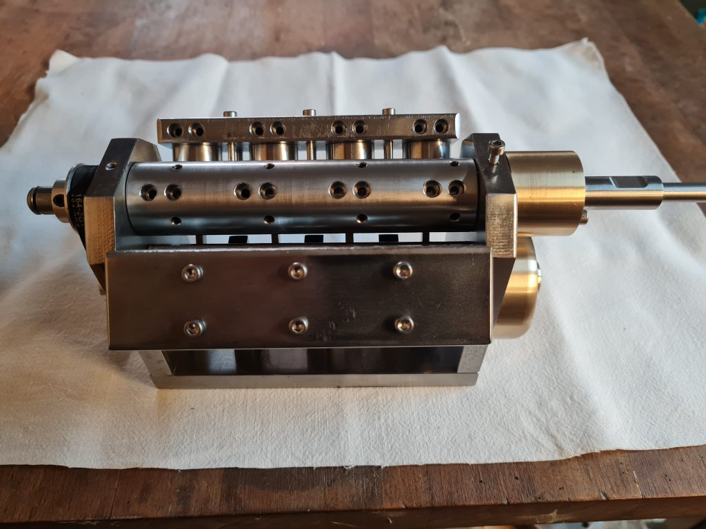 Die Herausforderung bei diesem 4-Zylinder Druckluftmotor ist zum einen die gebaute Kurbelwelle und zum anderen die Steuerwelle mit dem dünnen aber relativ langen Sackloch für die Luftzufuhr. Die Kurbelwelle und die Kurbelwellenlager müssen sehr exakt gefertigt werden, damit die gebaute Kurbelwelle nicht klemmt. Die Kurbelwelle hatte zunächst eine Gleitlagerung mit der der Motor auch schon gut gelaufen ist. Später wurde der Motor auf eine Nadellagerung umgebaut. Damit läuft er perfekt und ist zudem selbstanlaufend.